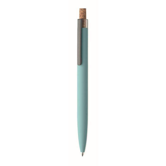 Balpen van gerecycled aluminium met kurken drukknop detail en metalen clip. Blauwe inkt.